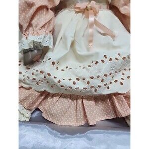 Vintage shelf sitter lamb doll featuring a soft plush body with ceramic head, and feet. This charming lamb has blue eyes and is dressed in a pink with tiny hearts dress white eyelet pinafore and red pantaloons it has discoloration on the white fabric. Designed to sit neatly on a shelf, bench, or edge, making it a sweet accent for farmhouse, country, or cottage decor.
