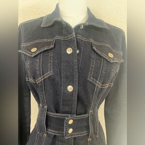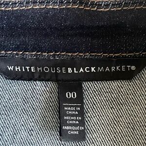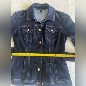 This White House Black Market dark-wash denim jacket is designed with corset-style seaming and a built-in waist belt that creates a sculpted, hourglass silhouette—far beyond the standard denim jacket. The deep indigo wash and gold-tone hardware elevate the look, giving it a polished, almost blazer-like presence.
