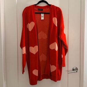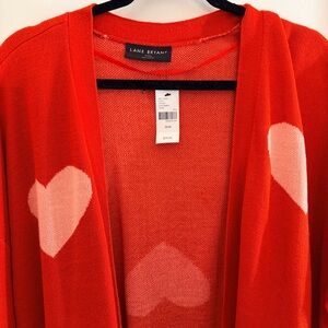 Stylish red cardigan with pink heart patterns. Perfect for layering. Comfortable and chic.