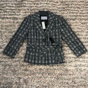Classiques Entier suit jacket. Created from fine European fabric, 25% wool, 29% cotton, 35% polyester. The belt is removable or be worn as a neck tie. Fashion piece to have. New with tag and a spare button