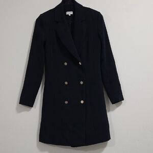 Timeless dark navy trench dress with double-breasted design. Ideal for versatile styling. Lined.
