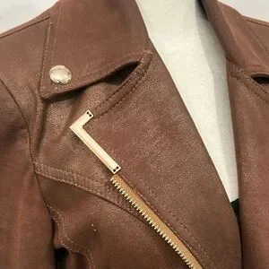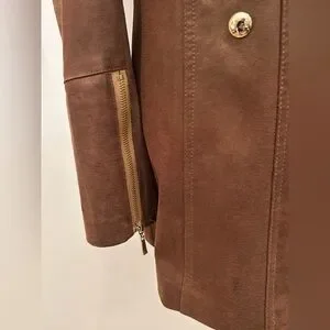 Boutique Sale! This is a women's brown faux leather military-style coat featuring a double-breasted design with gold-tone buttons and exposed gold zippers. The zippers are decorative and do not close. The zippers on the sleeves are functional.