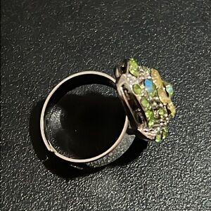 Dazzling silver ring adorned with vibrant green and yellow gems. Perfect for any occasion.