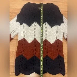 Stay warm and stylish with this cozy chevron knit sweater. Featuring a bold pattern in black, cream, and brown, it's perfect for any casual outing.
