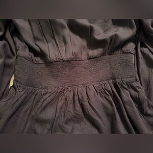 Chic deep blue blouse with V-neck. Features cinched waist and long sleeves. Ideal for versatile styling.