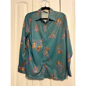Keywords: vintage shirt, floral print, retro style, button up, long sleeve, teal blouse, statement shirt, unique print, groovy, bold pattern, classic collar, feminine, casual wear