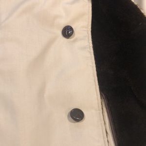 Three button closure with an extra button at the collar to keep cold air out.