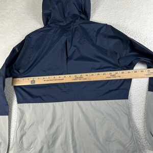 Style: Flash Forward Windbreaker, lightweight hooded jacket with full zip front in navy and gray colorblock design.