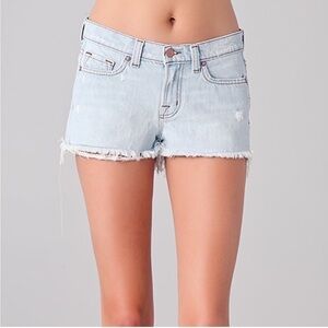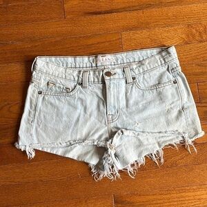 Adorable raw hem denim shorts. Intentional destressing throughout. Great light wash. In excellent condition. Size 29 which is the US equivalent of a size 8. Perfect for summer.