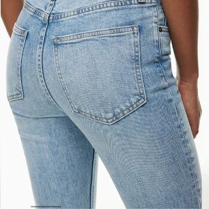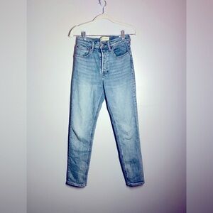 These high rise jeans feature a classic blue hue with a vintage-inspired design. The denim is rigid, offering a timeless look with natural fading for a lived-in feel. Slightly tapered towards the ankle, they provide a flattering silhouette.