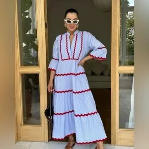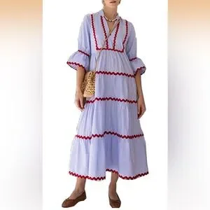 Elegant blue maxi dress with striking red ruffle details. Perfect for any occasion.
