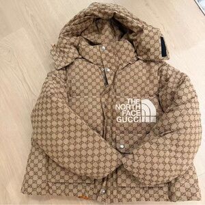 Luxurious puffer with signature Gucci pattern. Collaboration with The North Face. Cozy and stylish.