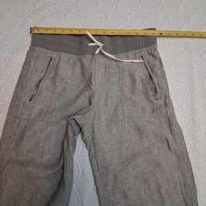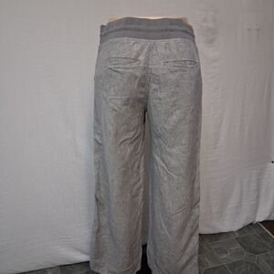 Stylish dark gray pants with a relaxed fit. Perfect for casual outings. This is a pair of Athleta Bali or Cabo linen wide-leg pants in gray. This is a pair of Athleta Cabo linen wide-leg pants in gray. size 6 Shell:100% linen Woven trim: 86% recyle polyester 14 % spandex is great condition weather travel