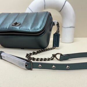 Stylish Coach crossbody with iridescent teal finish. Quilted design adds elegance. Chain strap for versatile wear.