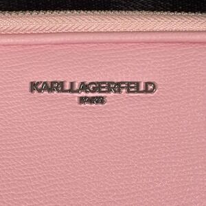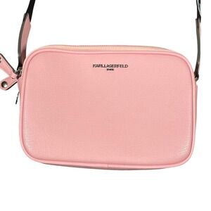Keywords: Karl Lagerfeld Paris, pink leather, camera bag, crossbody, detachable pouch, logo strap, designer bag, fashion accessory, statement strap, street style, evening bag, gift