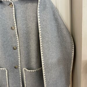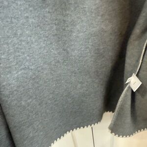 Chic gray cape with elegant white trim. Features button closure and front pockets. Original price $129 new with tags