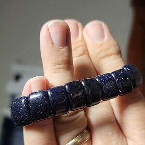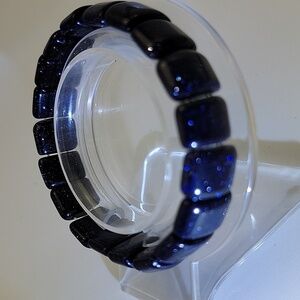 Sleek and stylish blue sandstone / Goldstone / Aventurine glass wearable stretch bracelet. Beads measure approx. 15mm-11mm-7mm.
