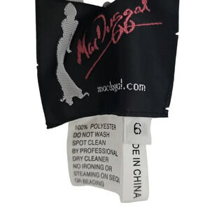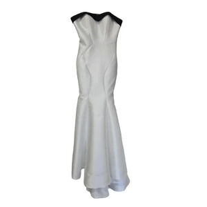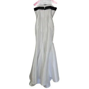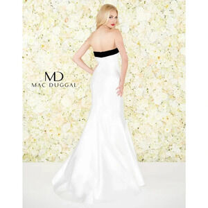 Mac Duggal Sweetheart Mermaid Gown in White. Size 6. Features sweetheart neckline with contrast black trim, strapless, fitted bodice, mermaid silhouette, sweep train, hidden back zip closure, and maxi length. Style 12182R. 100% Polyester. Excellent pre-owned condition, no flaws.