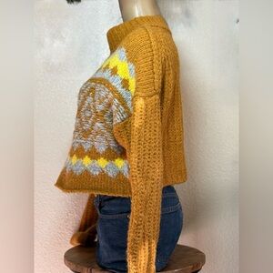 Chunky knit with a fair isle pattern in grey and yellow, a mock neck, wide sleeves, and a cropped silhouette. The material is a blend of acrylic, wool, nylon, and alpaca.
