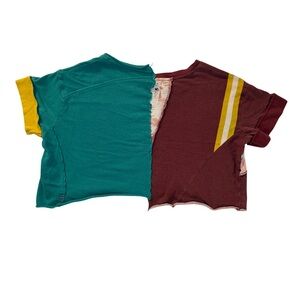 Vibrant short sleeve tee with maroon and teal color blocks. Deep V neck. Features yellow accents for a playful touch. Small hole in the back. Loved but taken care of, sold as is.