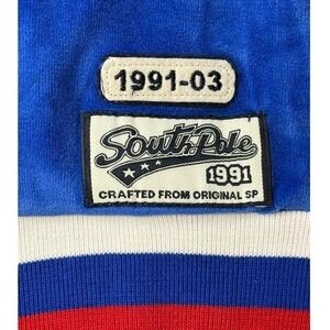 Vintage South Pole royal blue velour tracksuit set, size Medium. Short sleeve zip-up jacket with red and white striped cuffs and collar. Matching pants feature white stripes down the leg and a drawstring waist. Both pieces display the South Pole logo. New with original tags, Y2K