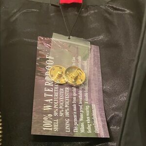 Stylish women's black jacket featuring elegant gold accents. Perfect for a chic and modern look. Waterproof. See tags.