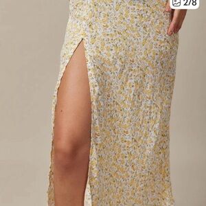 Chic asymmetrical dress with floral pattern. Features a stylish slit. Ideal for any event.