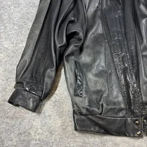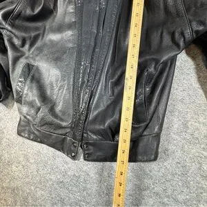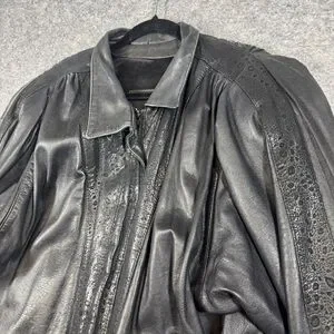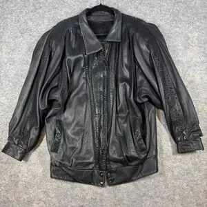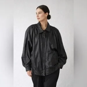 Vintage 80s Black Leather Bomber Jacket Women Oversized Puff Sleeve Retro Grunge