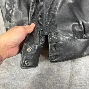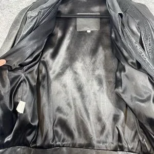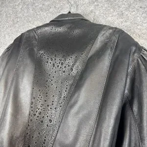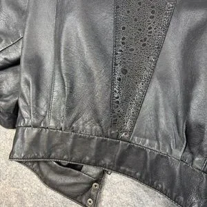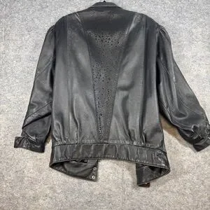• Design details: Zip front closure, collared neckline, front pockets, snap cuff sleeves, decorative perforated leather panels on back and sleeves, gathered shoulders.