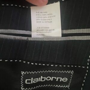 Great Condition! Claiborne Men’s Suit Jacket in Black with faint white stripes size 48L/ 40W. Perfect for any occasion with the fabric being 100% wool on the outer and the lining 100% acetate! Been sitting in the closet haven’t been worn in years looking for a new home!