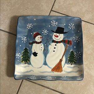 Celebrate the season with this charming holiday plate featuring a delightful snowman design. Perfect for adding a touch of winter magic to your home decor.