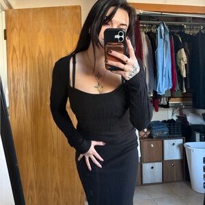 This elegant black dress features a stylish long sleeve design with a chic side slit, perfect for any occasion.