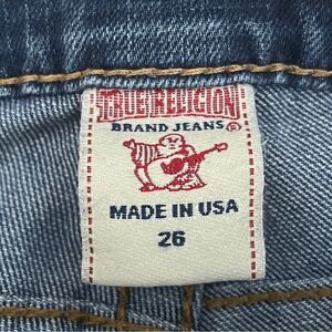 Some intentional distressing in front. Famous True Religion back button pockets.