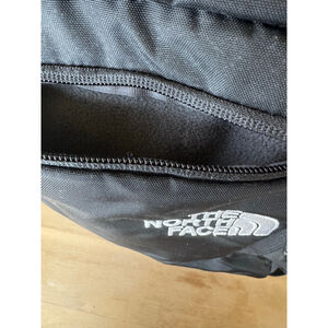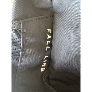 This is a black The North Face Fall Line backpack, featuring a main compartment with multiple internal pockets, including a padded laptop sleeve and a zippered mesh pocket. The exterior has a top zippered fleece-lined pocket, two side mesh pockets, and compression straps. The back panel and shoulder straps are padded with a "FLEXVENT" system for comfort. The backpack appears to be in excellent condition with no visible signs of wear.