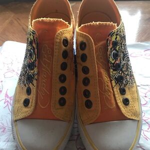(EUC) Excellent like new condition. Perfect for playful adventures. The Ed Hardy Tattoo Ink Slip On Sneakers in bright yellow and orange with signature Ed Hardy artwork. Women shoe featuring a laceless design with the iconic Ed Hardy logo and glitter accents. Made of canvas fabric with a low top sneaker shaft style, these sneakers are lightweight and cushioned for comfort during activities like gym training, walking, or running. The rubber outsole provides traction, while the breathable design makes them suitable for all seasons, making them a stylish and functional choice for casual or activewear outfits.