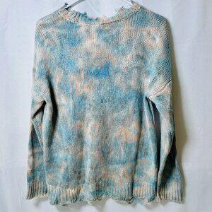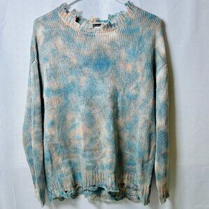 Versona Blue & Pink Tie-Dye Fringe Sweater | Boho Distressed Knit | Size Small