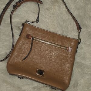 Stylish and versatile crossbody bag, this Dooney & Bourke women's bag features a chic tan exterior with a vibrant red interior. Perfect for any occasion.