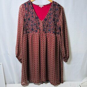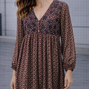Jodifl Boho Floral V-Neck Dress Brown & Navy Lined Long Sleeve Size S Runs Big
