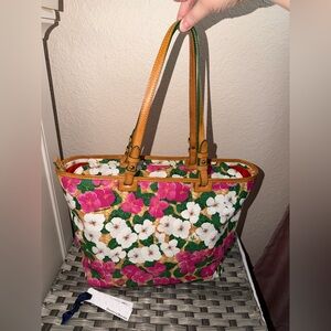Dooney and Bourke tote, Dooney Leisure Shopper, floral Dooney bag, fuchsia Dooney tote, pink floral handbag, coated canvas tote, leather trim tote, zip top tote, shoulder tote bag, spring summer handbag