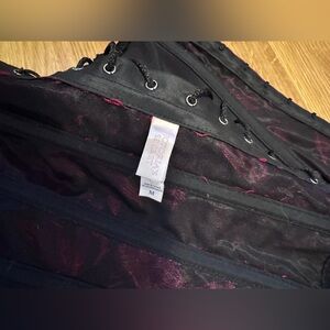 This Y2K vintage Victorias secret corset is screaming vivienne westwood! Hooking down the front and lacing up the back makes it easy to get into. It has a scoop style neckline and thin straps with contrasting panels of black satin, and red floral satin. Has boning. Marked a size medium with somewhat flexible sizing due to lace up back. Model is 36/30 for size reference.