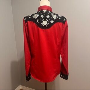 Red and black western shirt by Roper. 6 black pearl snaps up the front and 5 at each cuff. Amazing silver starburst embroidery on chest and back and sleeve cuffs with silver rhinestones throughout. 2 “smiley” pockets on front, but they are just for show they are not functional pockets. An amazing and unique western shirt!