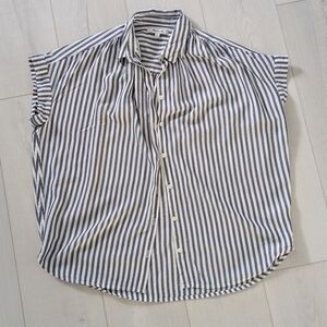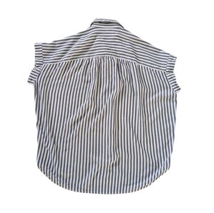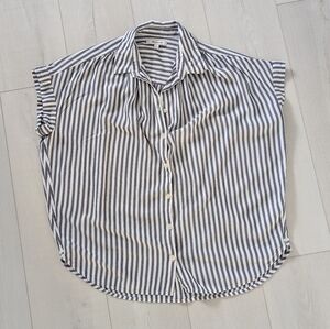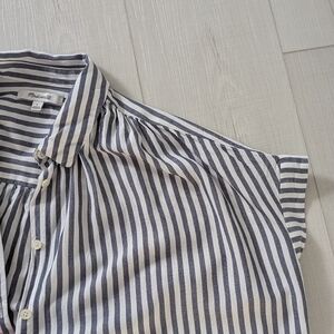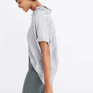 Madewell slightly oversized effortless tunic top. Spread collar, short cuffed sleeves and front button closure. Side slits, dimensional stripes print. Ideal length to tuck into jeans for a carefree half-tucked look. Wear as a cover-up.