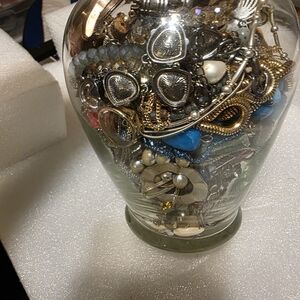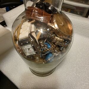 Elegant glass vase full of costume jewelry and some watches all used but in good condition im gonna keep add as I found more jewelry... I buy lockers so I have a lot of costume jewelry