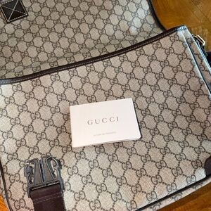 Gucc Supreme Crossbody/shoulder bag with iconic monogram pattern. Great for travel, big enough to fit all your travel essentials. Features a stylish black and cream design. Perfect for Travel, work or everyday elegance.