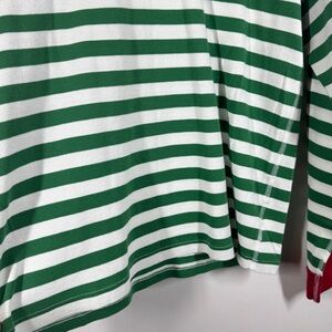 • Long sleeve crewneck top, green and white stripe print, red contrast collar and cuffs, elastic waist pants with ankle cuffs, two-piece matching set