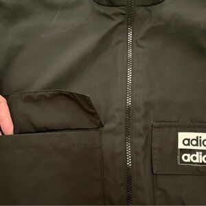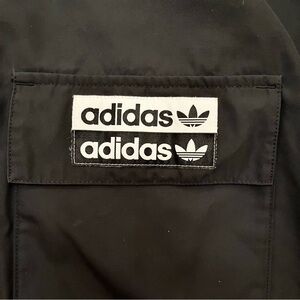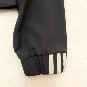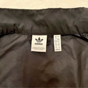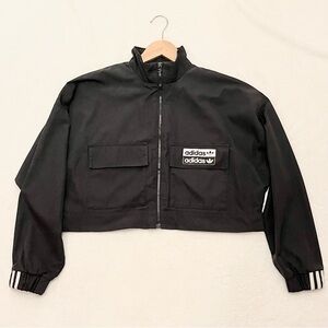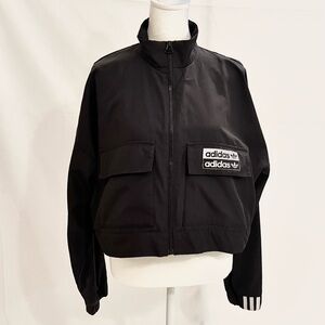 Adidas Originals R.Y.V. cropped track top in black. Lightweight woven track jacket with full zip front, stand collar, and relaxed boxy fit. Features two front flap pockets, stacked Adidas logo patches on the chest, and signature three-stripe detail at the cuffs. Excellent like new condition. (Stock photos included for fit reference)