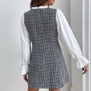 Black and White Elegant Women's Plaid Flounce Sleeve Frill Trim Tweed Dress