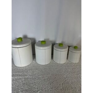 Adorn your kitchen with this charming Ransburg canister set, showcasing delightful fruit trees in full bloom. Each canister features a vibrant illustration of a tree laden with apples, pears, oranges, or plums, topped with a cheerful lime green lid. These vintage gems evoke a sense of nostalgic charm, perfect for storing your pantry staples while adding a whimsical touch to your countertop. Imagine them gracing your kitchen during a cozy breakfast or serving as delightful accents for a harvest-themed gathering.