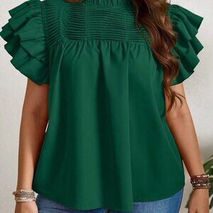 Dark Green Casual Women's Plus Size Ruffle Trim Blouse