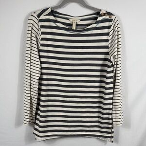 Stylish long sleeve top with classic stripes. Features button accents on shoulder. Perfect for casual wear.